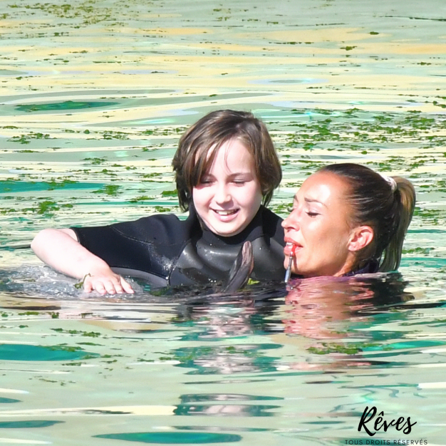 Un par un les jeunes filles vont réaliser leur rêve et nager avec les dauphins pendant plusieurs minutes dans le grand bassin où pour un moment la maladie est oubliée.