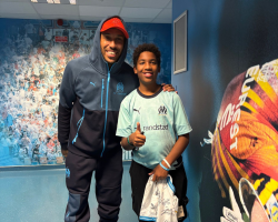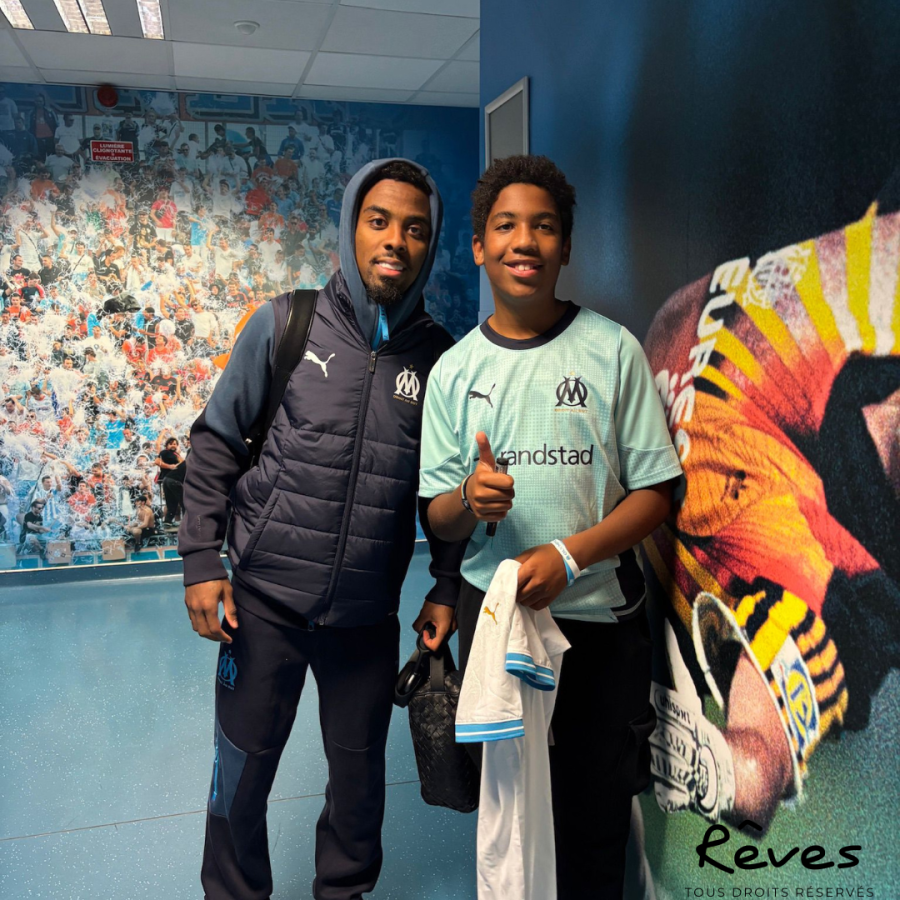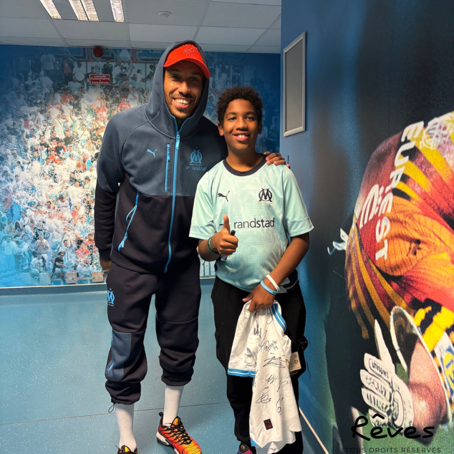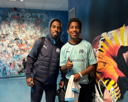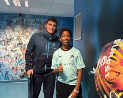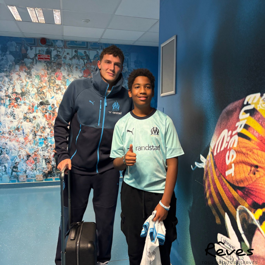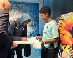 À la fin du match, nous avons retrouvé l’accompagnateur de la Fondation OM, qui nous a offert une visite privée du stade ainsi qu’une rencontre avec les joueurs de l’équipe. Joël a reçu un cadeau surprise : un maillot de l’OM dédicacé par l’ensemble des joueurs, qu’il a pu faire signer lui-même et immortaliser avec plusieurs photos.