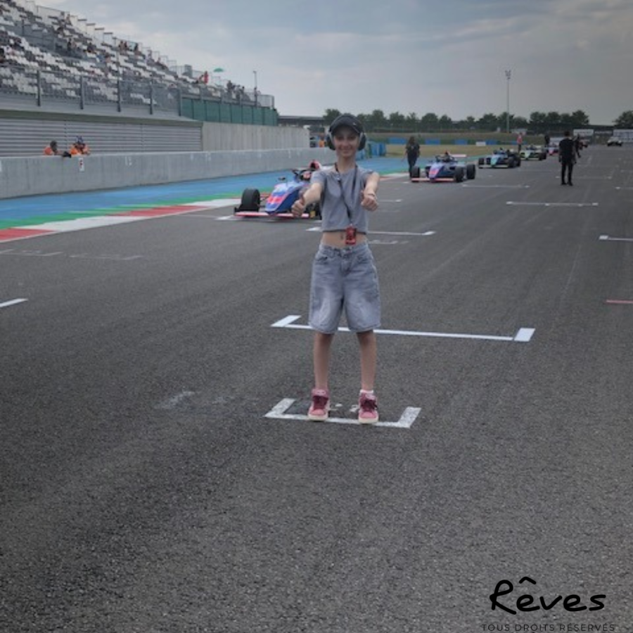 Le lendemain, c’est avec impatience que Kenza s’apprête à visiter les écuries. Et là, magie, elle est autorisée à fouler la grille de départ et la piste, au plus près des bolides, cinq minutes avant le départ de la course. C’est parti ! Elle suit la course depuis les écuries, où les résultats de chaque pilote s’affichent à chaque tour. Kenza observe attentivement l’évolution de « ses préférés », avec qui elle a pris des photos plus tôt. Elle rejoint le podium pour assister à la remise des prix et ne manque pas de poser avec le vainqueur.