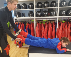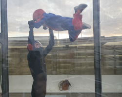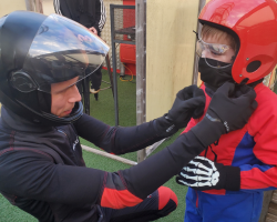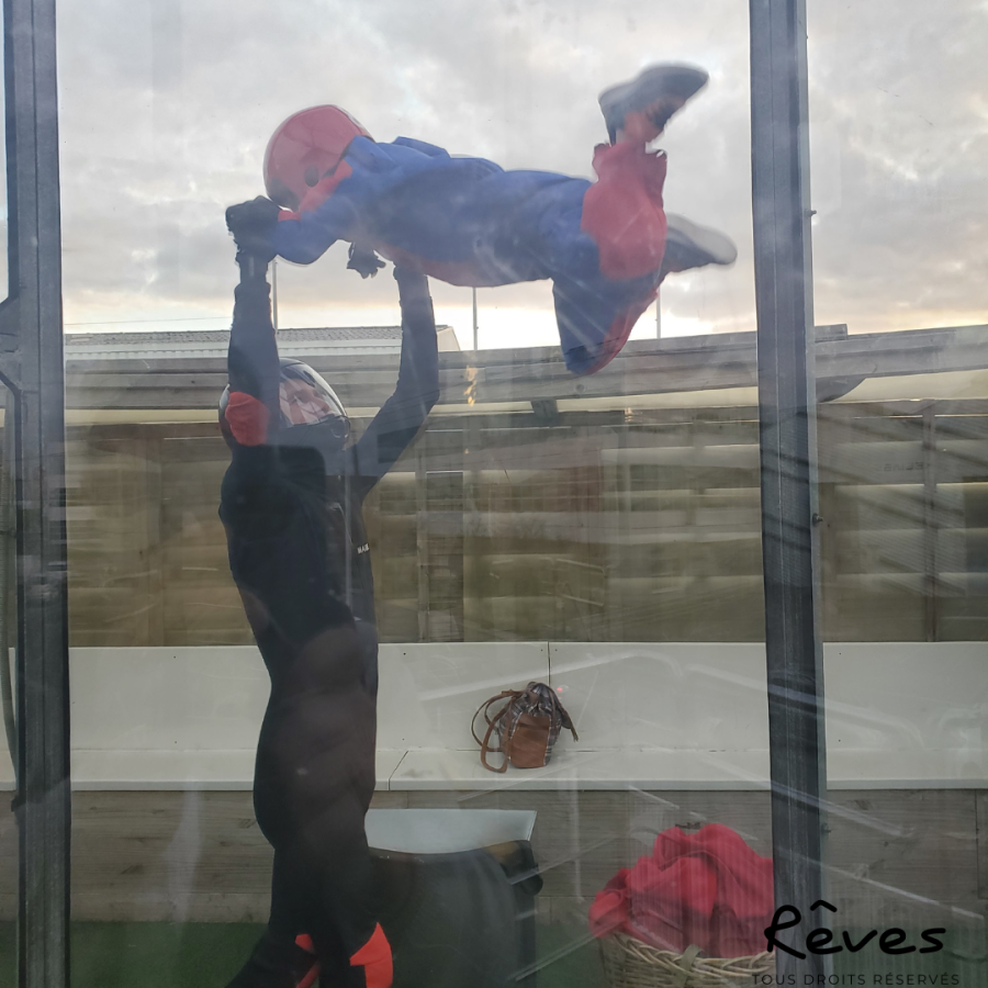 Lorsqu’ils arrivent au spot AirFly, Maxime, le moniteur, accueille la petite troupe avec un grand sourire. Un petit check de bienvenu et c’est parti pour d’abord s’équiper. Léo choisit une combinaison de Spiderman et un casque rouge assorti. Viennent ensuite les premières explications sur l’aérodynamisme et une petite répétition. Allongé à plat ventre sur un banc, Léo se cambre légèrement, tend les bras et les jambes, légèrement fléchis. « C’est important » lui dit Maxime, « Tu dois prendre la même position qu’un parachutiste en chute libre ».