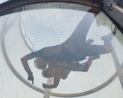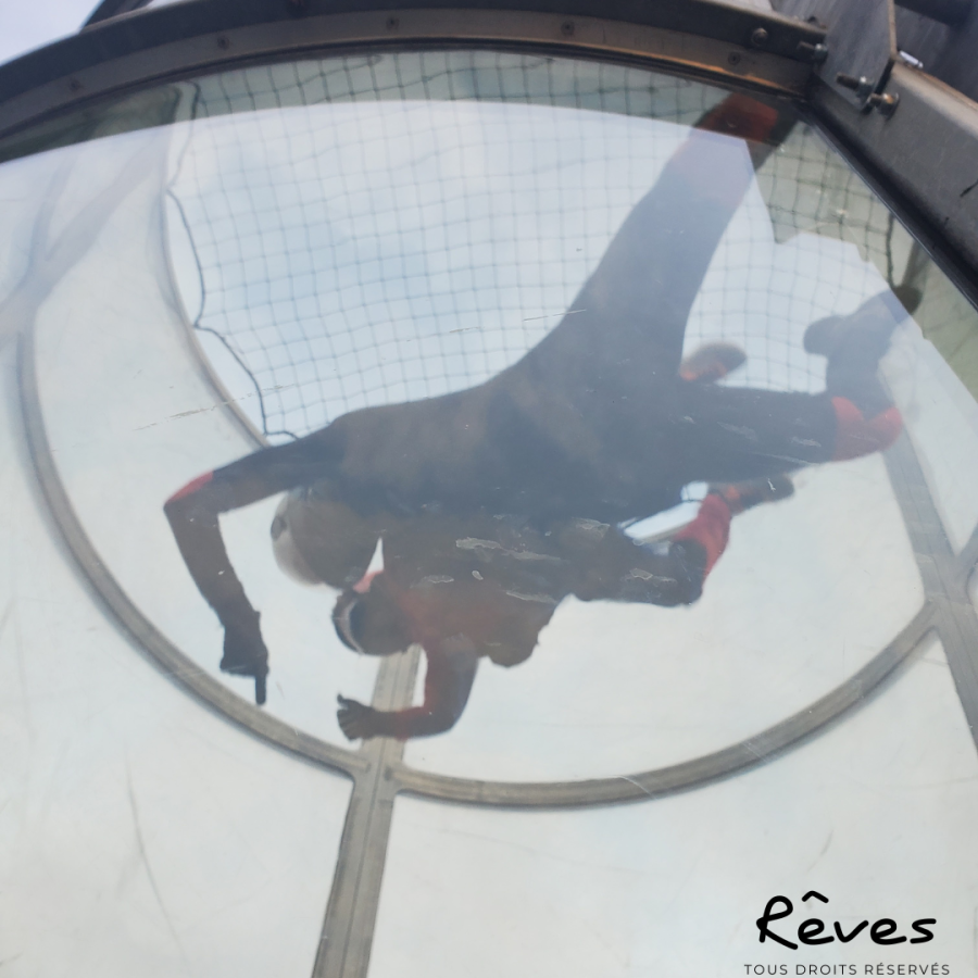 Il est temps maintenant de rejoindre le « tube », de rajouter à l’équipement des lunettes spéciales, des gants et de mettre des bouchons d’oreille car le moteur et les hélices souterraines commencent à faire un énorme bruit d’avion. Il n’est plus temps de discuter, car on ne s’entend plus, mais de pénétrer enfin, en duo avec Maxime, dans cette gigantesque soufflerie. L’arrivée d’air augmente petit à petit et Léo se sent de plus en plus léger. Ses pieds quittent le sol. Sur un signal de Maxime, il prend la position idéale, tend le pouce pour signifier que tout est ok. Ça y est, Léo s’envole…. Léo vit son rêve, Léo vole enfin, Léo est un oiseau… Ce vent à plus de 200 km/h le propulse dans des sensations qu’il avait imaginées tant de fois.