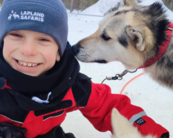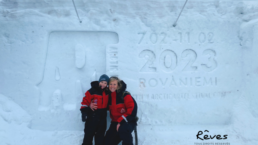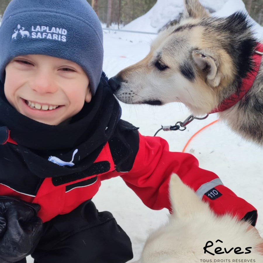 Bien évidemment, nous ne pouvons pas partir de Laponie sans rencontrer les rennes et les huskies. Après une petite initiation à la conduite de traîneau nous expliquant le fonctionnement et les règles de sécurité, nous pouvons embarquer. Nous sommes impressionnés par l’excitation des chiens, pressés de partir en balade. Au contraire, les rennes sont tranquilles et nous réalisons une balade tout en douceur sous la neige, après avoir assisté à une cérémonie de passage du cercle polaire arctique. Une bulle de bonheur supplémentaire !