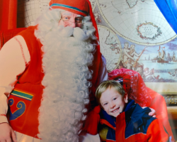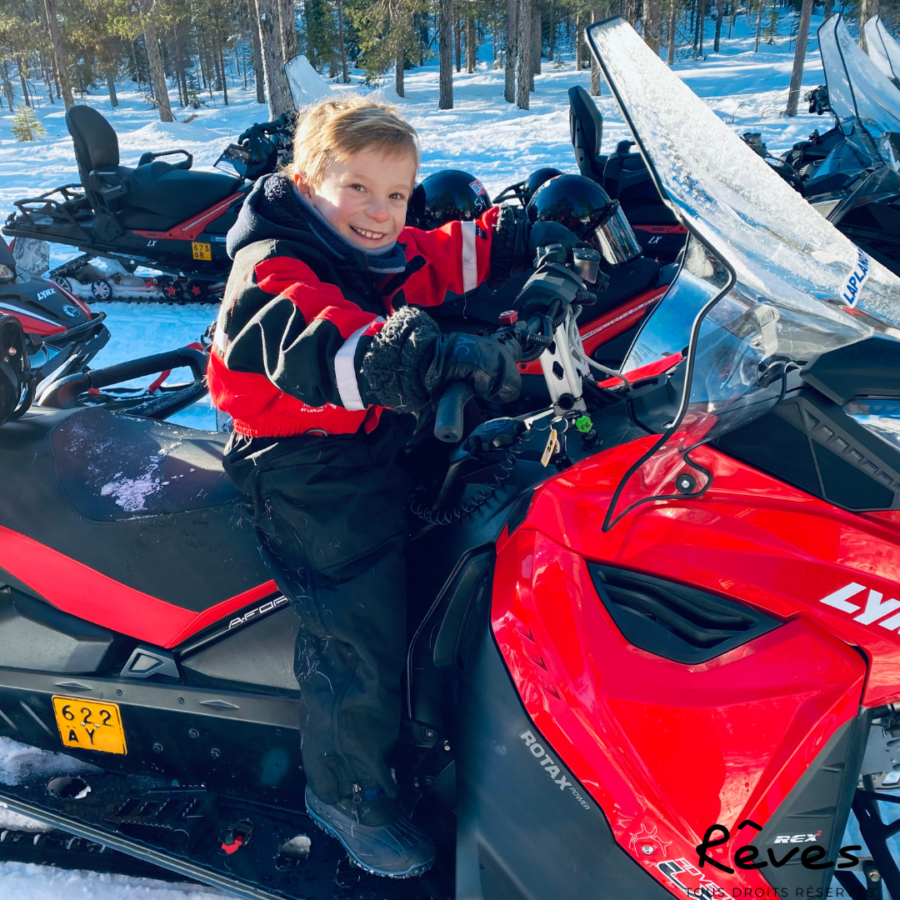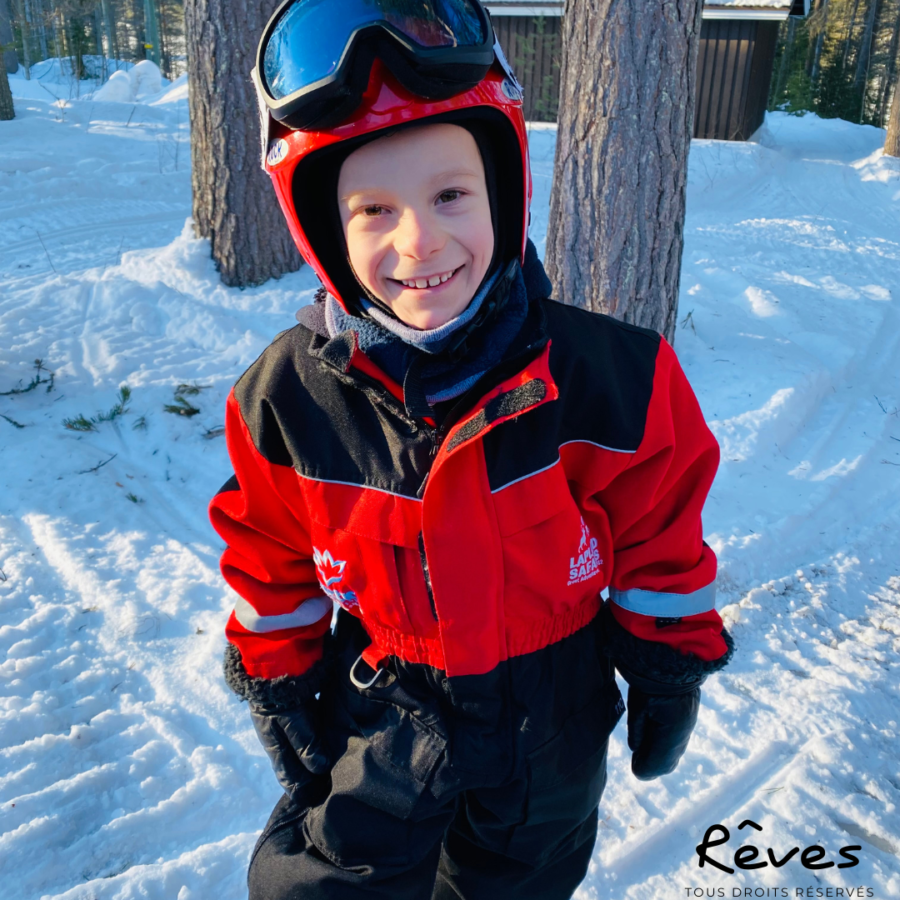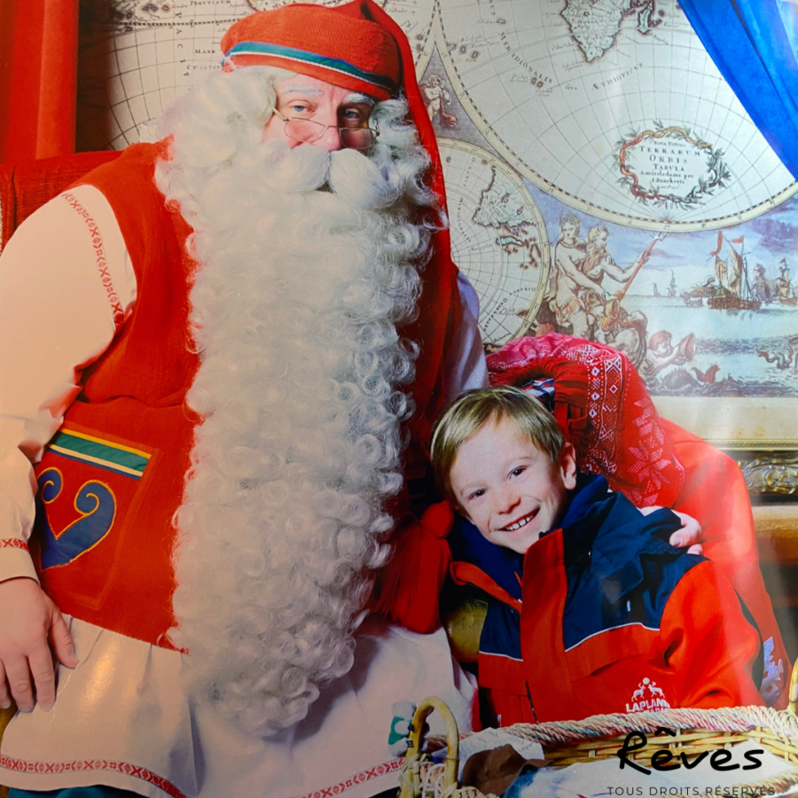 Arrive enfin LE grand jour ! La rencontre avec le Père Noël est prévue pour ce matin ! Nos trois rêveurs affichent de grands sourires, ils sont pressés… Dans la file d’attente du bureau du Père Noël au Santa Claus Village, ils se posent beaucoup de questions : Que va-t-il nous dire ? Va-t-il nous parler en Français ? Les cadeaux emballés sont-ils des vrais ? etc. Ils regardent partout… C’est enfin notre tour ; les enfants sont impressionnés. Il nous a dit « bonjour » en Français. Ces quelques minutes magiques passent à une allure folle. Il était vraiment là en chair et en os. C’est donc la tête pleine de belles images et le cœur plein de joie que nous quittons le bureau du Père Noël pour aller faire un tour de motos neige spéciales enfants. Ils sont surexcités, font la course et s’amusent comme des petits fous. Ils ont adoré et passé ainsi un merveilleux moment. Un dernier petit tour dans les boutiques du village leur permet de choisir leurs cadeaux de « Rêves » : doudous, magnets, cartes postales, motoneige miniature, t-shirt, etc.