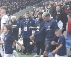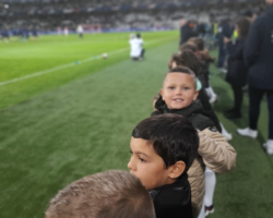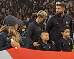 Mylan accompagne Antoine GRIEZMANN. Dans le couloir, avant d’entrer sur la pelouse, les joueurs lui font un « check » et échangent avec lui quelques mots sympathiques. Antoine GRIEZMANN s’aperçoit que Mylan a froid, lui offre sa veste de l’équipe de France. Mylan est sur un nuage… Fier de sa prestation sur le terrain, Mylan rejoint ses parents en tribune pour suivre le match.
