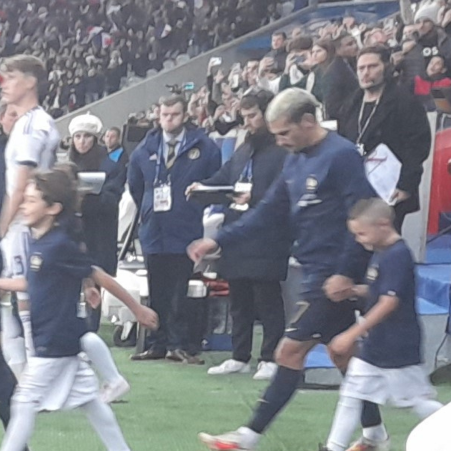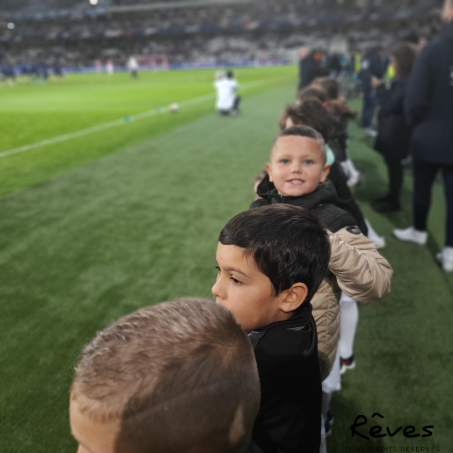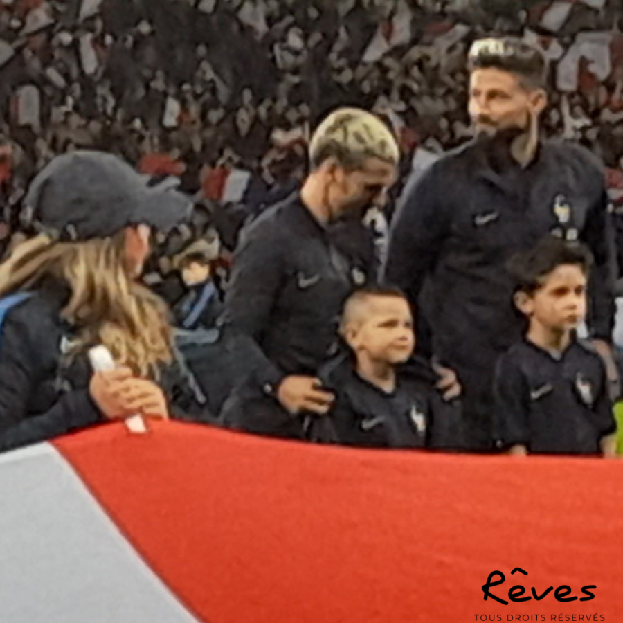 Mylan accompagne Antoine GRIEZMANN. Dans le couloir, avant d’entrer sur la pelouse, les joueurs lui font un « check » et échangent avec lui quelques mots sympathiques. Antoine GRIEZMANN s’aperçoit que Mylan a froid, lui offre sa veste de l’équipe de France. Mylan est sur un nuage… Fier de sa prestation sur le terrain, Mylan rejoint ses parents en tribune pour suivre le match.